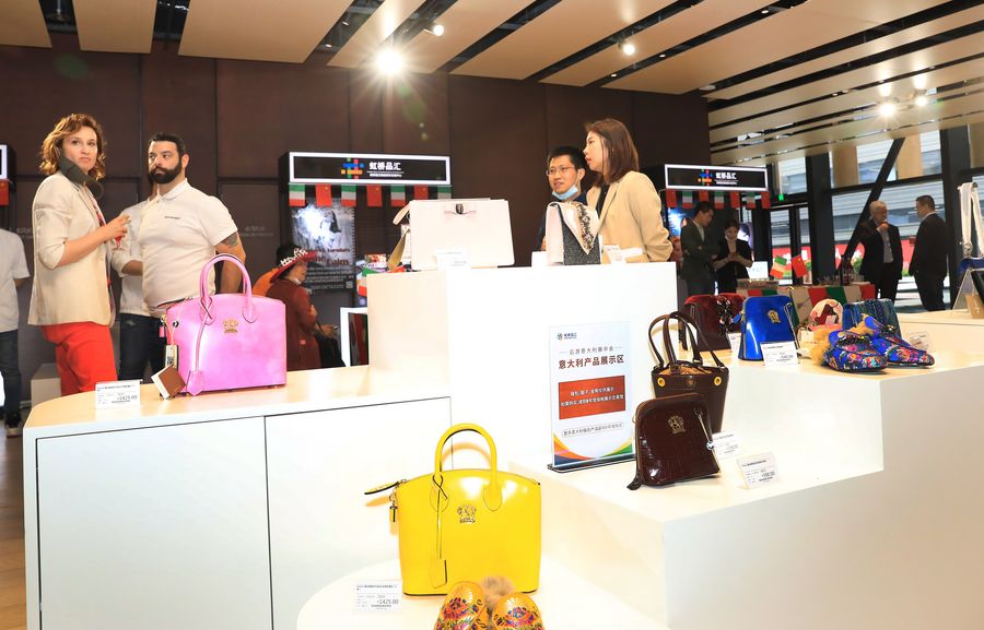 Visitors view exhibits during an Italy-themed exhibition held at the Hongqiao Import Commodity Exhibition and Trade Center in east China's Shanghai, May 8, 2020. An exhibition featuring Italian commodities was held here on Friday, presenting Italian culture, food and fashion trend to visitors. (Xinhua/Fang Zhe)