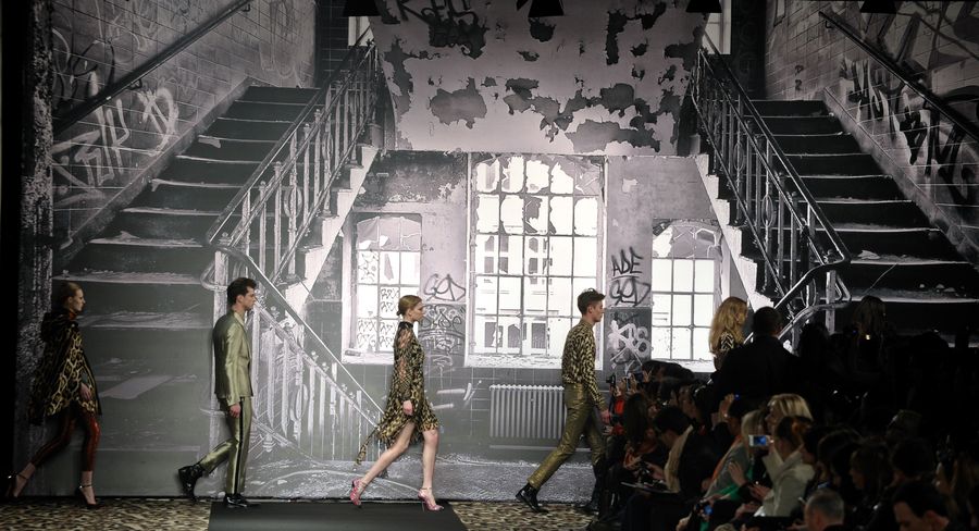 Models present creations of the Italian fashion brand Just Cavalli during the Milan Fashion Week Women's Wear Fall/Winter 2012 in Milan, northern Italy, Feb. 24, 2012. (Xinhua/Wang Qingqin)