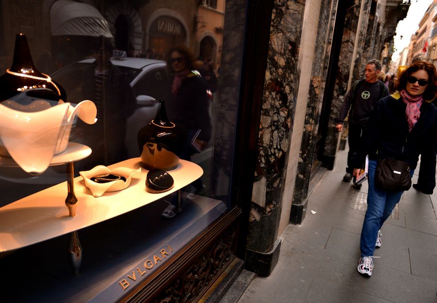 People pass by a jewellery display window in Rome on April 4, 2013. (Xinhua/Xu Nizhi)