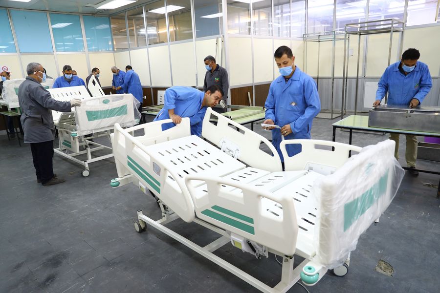 Workers assemble white adjustable hospital beds in a military-run factory in Cairo, Egypt on May 9, 2020. (Xinhua/Ahmed Gomaa)