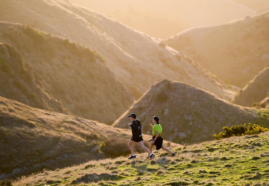 Two children run on a hill at sunset in Wellington, New Zealand, April 25, 2020.(Xinhua/Guo Lei)