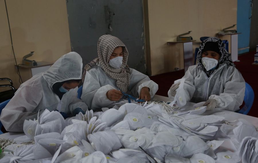 Workers make face masks at a factory in Kabul, capital of Afghanistan, April 14, 2020. (Xinhua/Rahmatullah Alizadah)