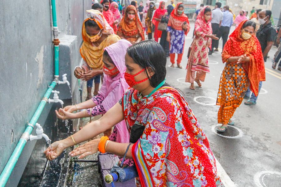 Workers wash their hands before entering a garment factory in Dhaka, Bangladesh, on May 7, 2020. (Str/Xinhua)