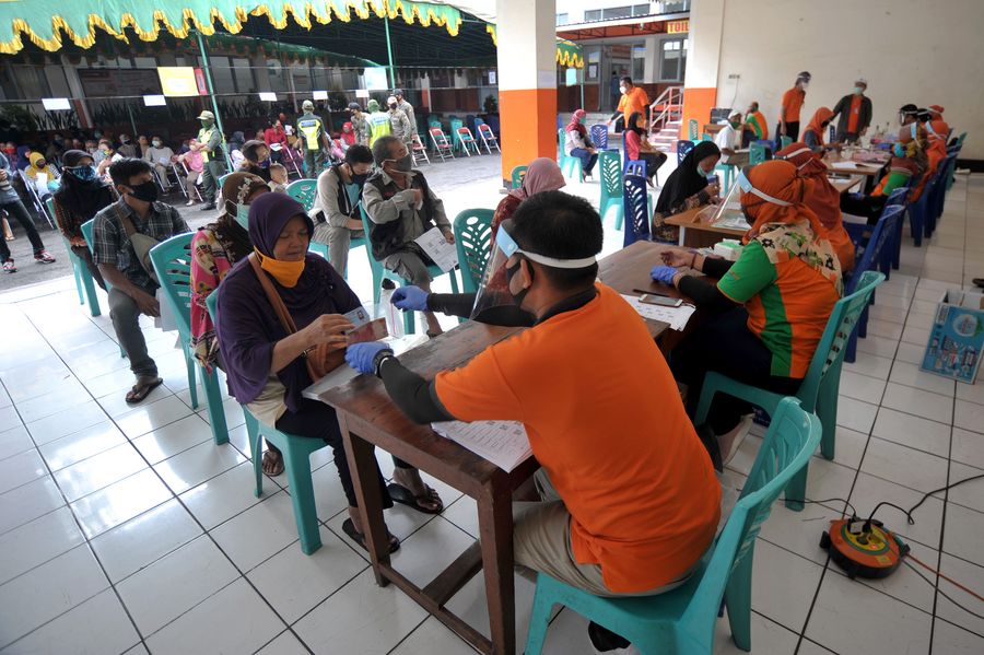 Post office officials wearing face shields provide social assistance service to poor families amid the COVID-19 outbreak in Yogyakarta Post Office, Indonesia, May 9, 2020. (Photo by Supriyanto/Xinhua)