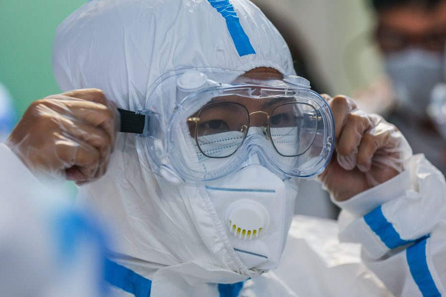 A healthcare worker from the Philippine Coast Guard wears protection equipment inside a newly-converted COVID-19 mass testing center in Manila, the Philippines, on May 5, 2020. (Xinhua/Rouelle Umali)