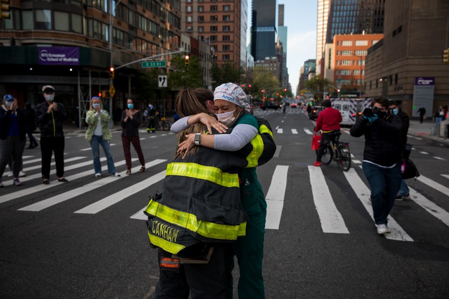 A firefighter hugs Samantha Giambalvo (R), a traveling nurse from Alabama who has been working in New York since April 6, as firefighters and residents show appreciation for healthcare workers at NYU Langone Medical Center amid the COVID-19 outbreak in New York, the United States, May 9, 2020. (Photo by Michael Nagle/Xinhua)