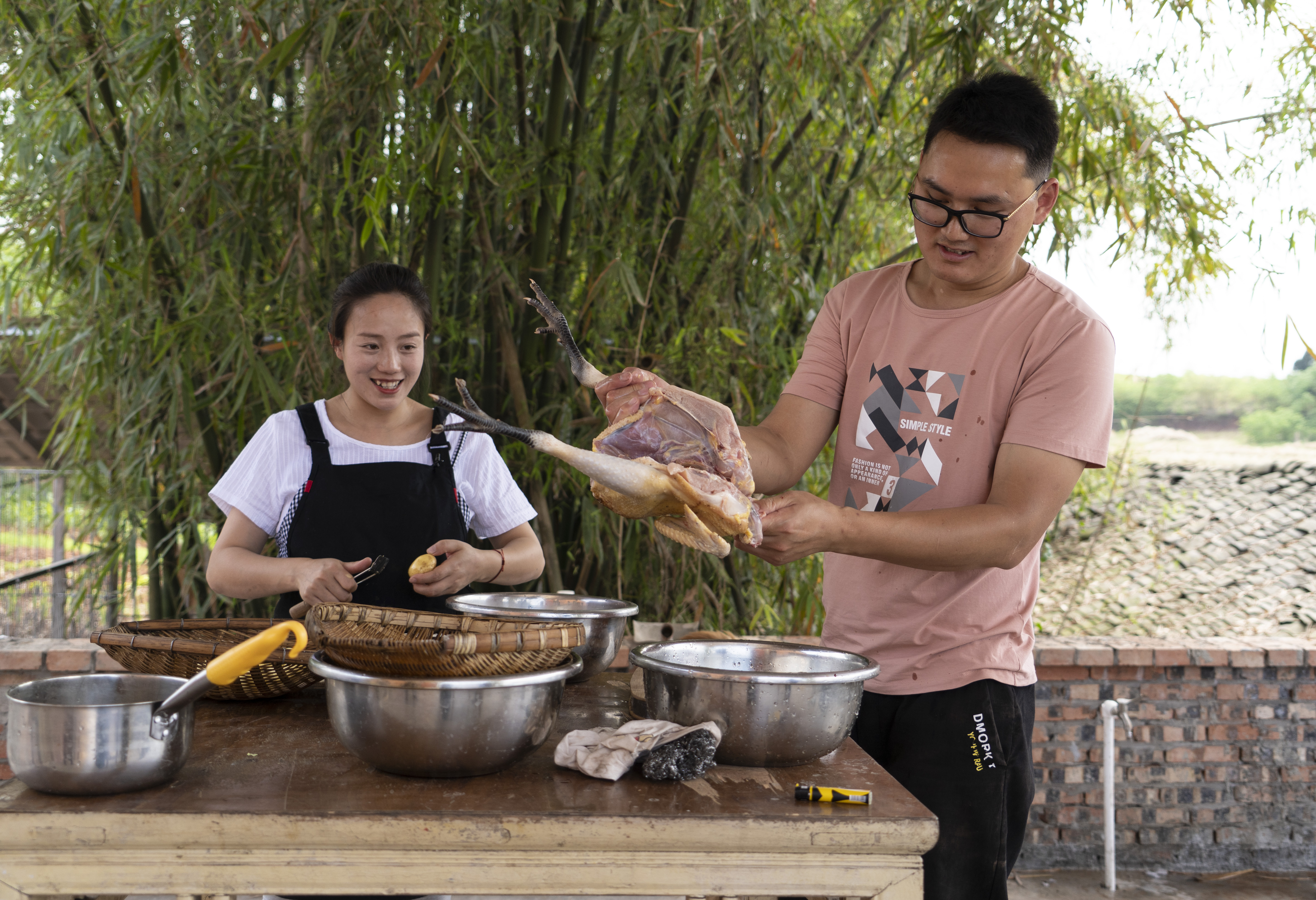 Zhou Xiaolong and Xu Yan cook a meal in Baihua Town, Yibin City of southwest China's Sichuan Province, April 27, 2020. (Xinhua/Li Mengxin)