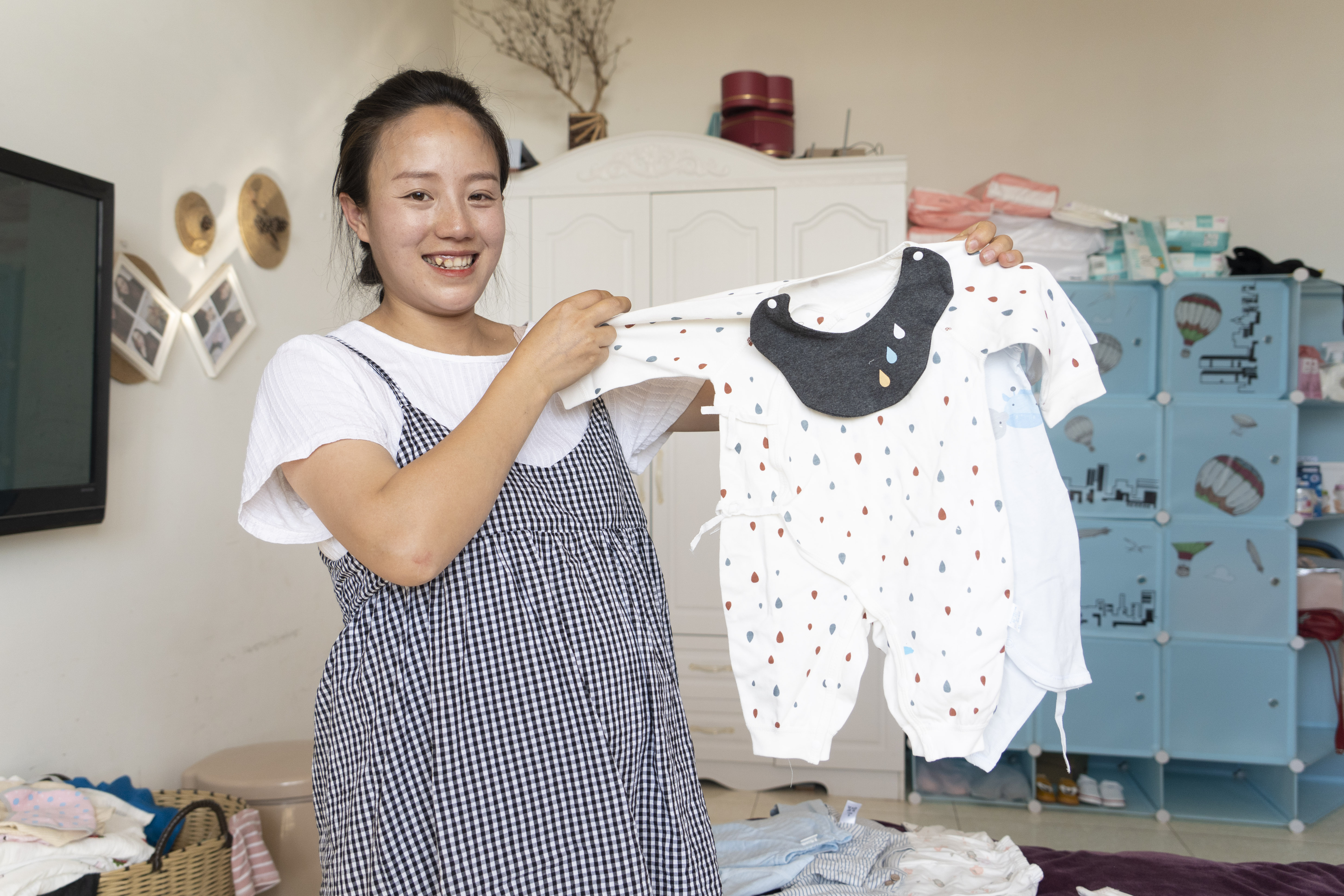 Xu Yan displays the clothes for her unborn baby in Baihua Town, Yibin City of southwest China's Sichuan Province, April 27, 2020. (Xinhua/Li Mengxin)