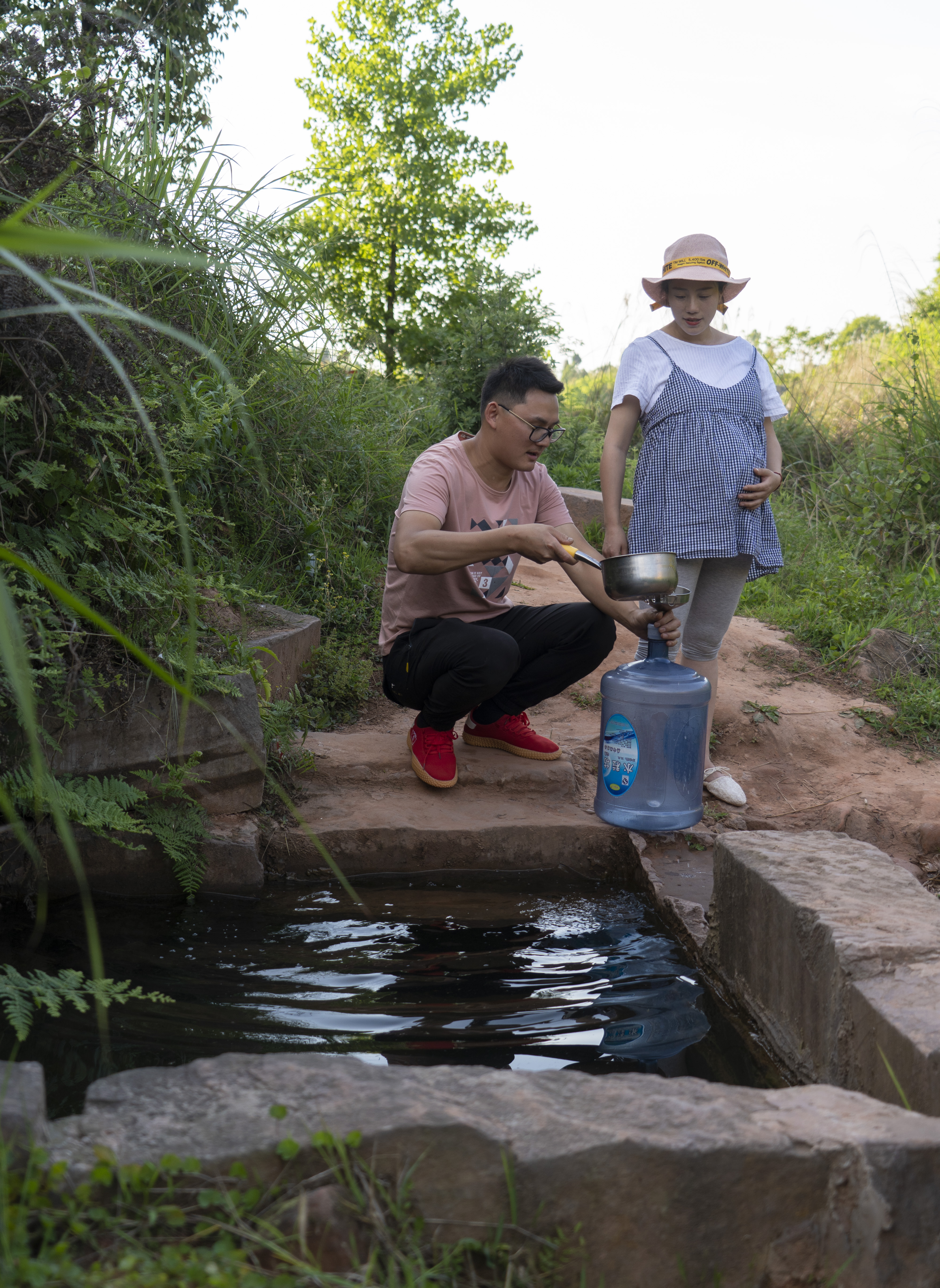 Zhou Xiaolong (front) pours mountain spring water into a barrel in Baihua Town, Yibin City of southwest China's Sichuan Province, April 27, 2020. (Xinhua/Li Mengxin)