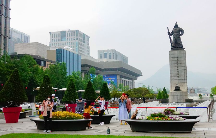People take pictures on Gwanghwamun Square in Seoul, South Korea, May 10, 2020. South Korea reported 34 more cases of the COVID-19 compared to 24 hours ago as of 0:00 a.m. Sunday local time, raising the total number of infections to 10,874. (Xinhua/Wang Jingqiang)
