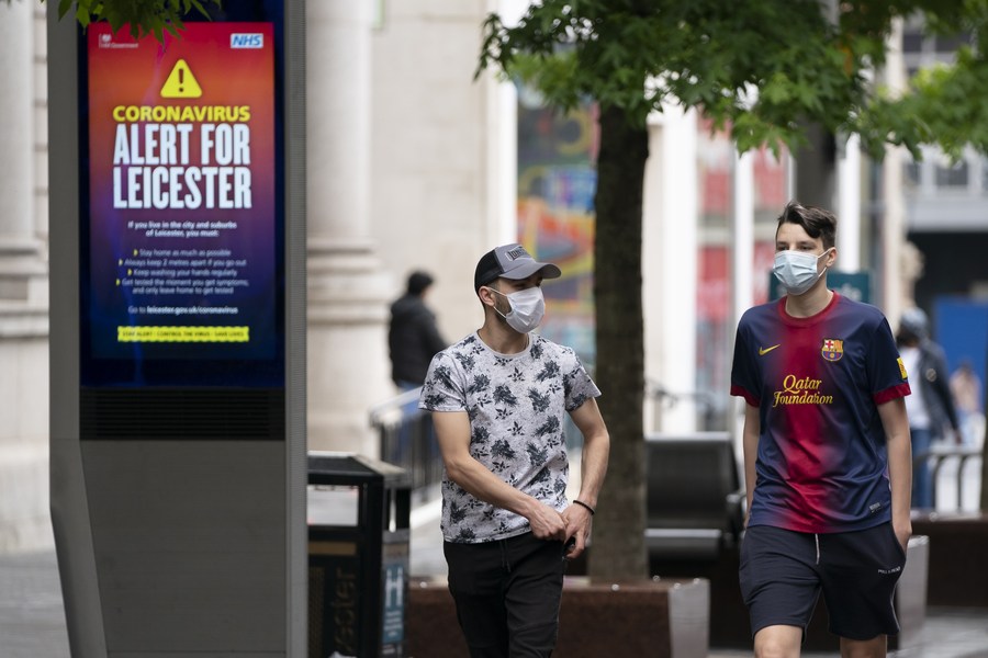 People wearing face masks walk on the street after localized lockdown in Leicester, Britain, July 1, 2020. (Photo by Jon Super/Xinhua)