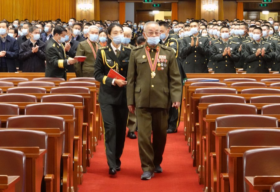 A Chinese People's Volunteers (CPV) veteran enters the venue of the meeting marking the 70th anniversary of the CPV entering the Democratic People's Republic of Korea to fight in the War to Resist U.S. Aggression and Aid Korea at the Great Hall of the People in Beijing, capital of China, Oct. 23, 2020. (Xinhua/Lai Xiangdong)