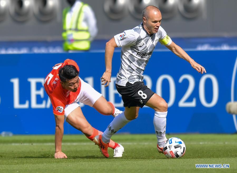 Andres Iniesta (R) of Vissel Kobe vies with Yan Dinghao of Guangzhou Evergrande FC during a Group G football match of the AFC Champions League in Doha, Qatar, Nov. 25, 2020. (Photo by Nikku/Xinhua)