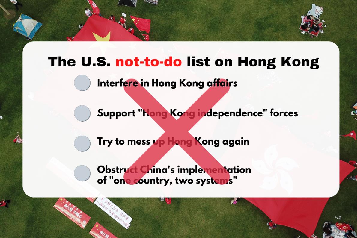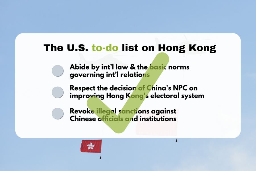 It also called on the U.S. side to revoke illegal sanctions against Chinese officials and institutions, stop trying to mess up Hong Kong again, and cease obstructing China's implementation of "one country, two systems."