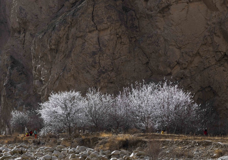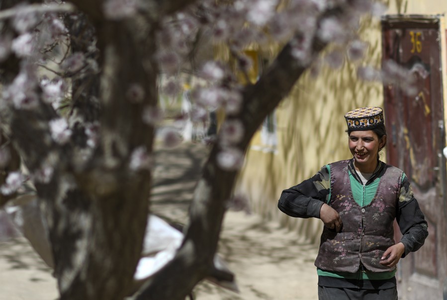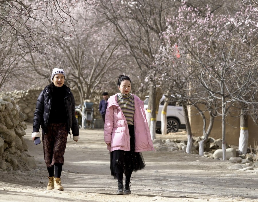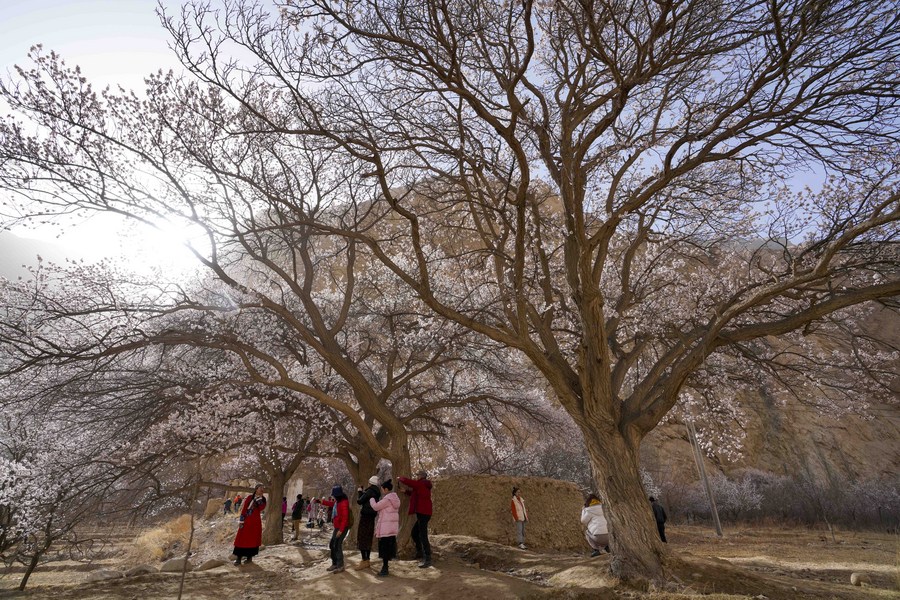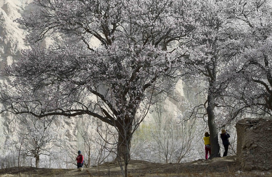 Visitors take photos under apricot trees in Bageaigezi Village of Akto County, northwest China's Xinjiang Uygur Autonomous Region, March 31, 2021. (Xinhua/Zhao Ge)