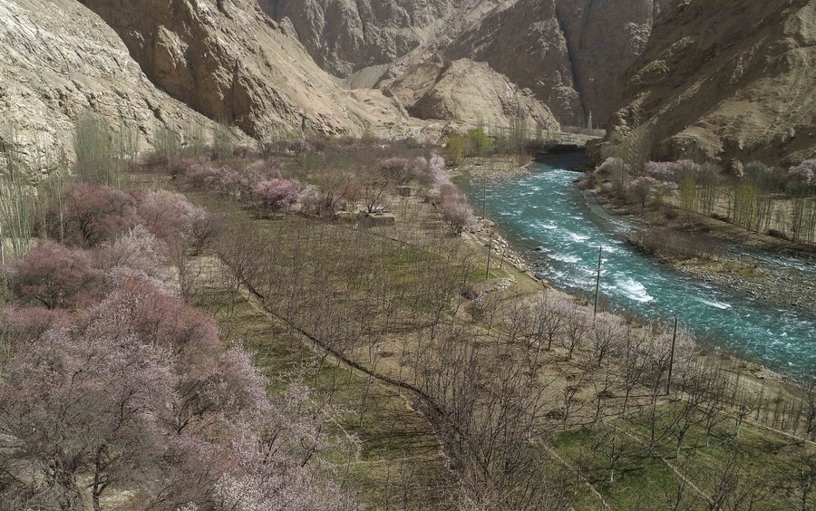 Aerial photo taken on March 31, 2021 shows a farm house surrounded by apricot trees in Bageaigezi Village of Akto County, northwest China's Xinjiang Uygur Autonomous Region. (Xinhua/Zhao Ge)