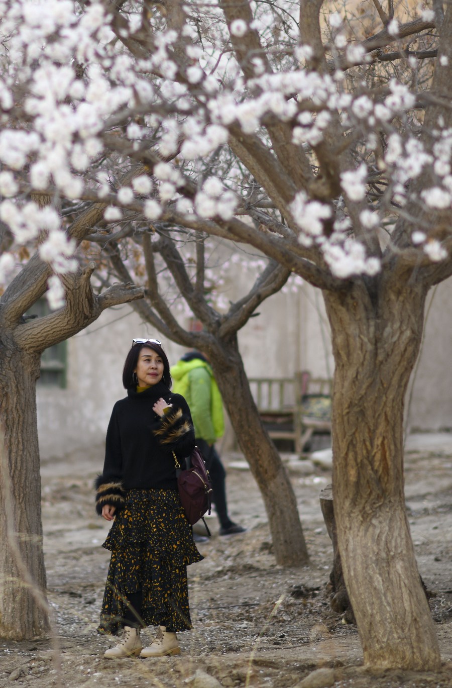 Visitors take photos under apricot trees in Bageaigezi Village of Akto County, northwest China's Xinjiang Uygur Autonomous Region, March 31, 2021. (Xinhua/Zhao Ge)■