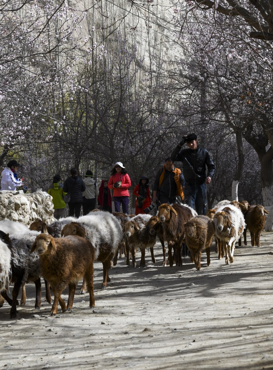 Visitors enjoy the scenery as herdsmen prepare to pasture in Bageaigezi Village of Akto County, northwest China's Xinjiang Uygur Autonomous Region, March 31, 2021. (Xinhua/Zhao Ge)