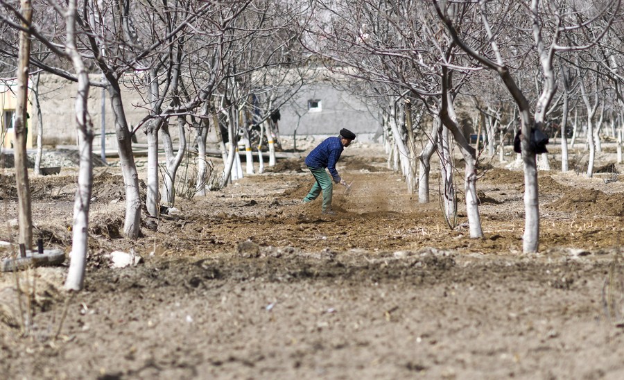 A villager does spring ploughing in Bageaigezi Village of Akto County, northwest China's Xinjiang Uygur Autonomous Region, March 31, 2021. (Xinhua/Zhao Ge)