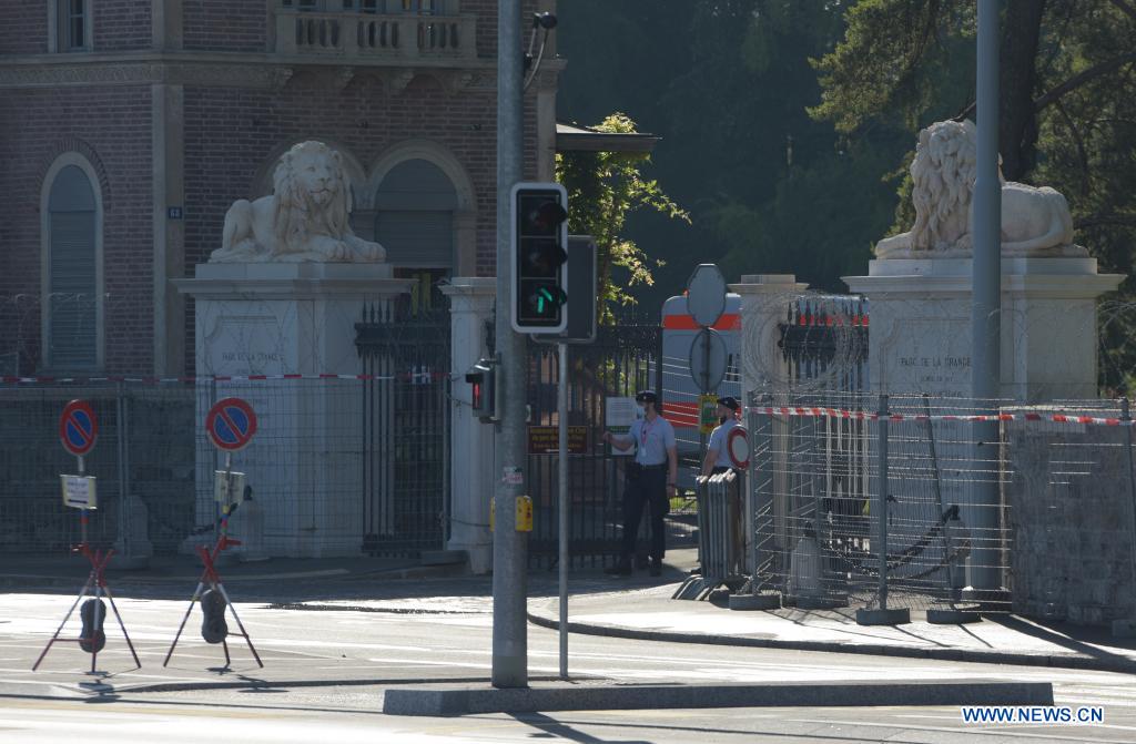 Security officers stand guard at an entrance to the Villa La Grange, the venue for the upcoming Biden-Putin summit, in Geneva, Switzerland, on June 15, 2021. U.S. President Joe Biden and his Russian counterpart Vladimir Putin are set to meet in the Swiss city of Geneva on Wednesday, which will be the two leaders' first face-to-face meeting since the Biden administration took office on Jan. 20. (Xinhua/Guo Chen)