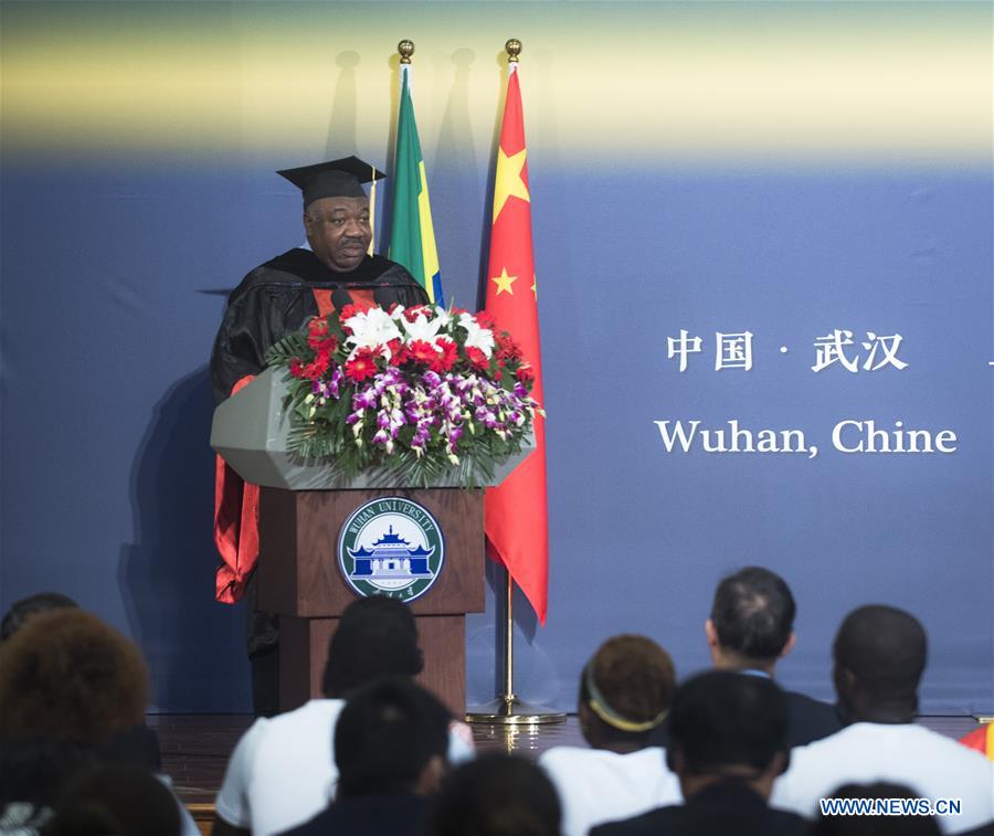 Gabonese President Ali Bongo Ondimba addresses a ceremony of granting honorary doctorate to him at Wuhan University in Wuhan, central China's Hubei Province, Sept. 6, 2018. Gabonese President Ali Bongo Ondimba has been conferred an honorary doctorate in law by the elite Wuhan University during his visit to central China's Hubei Province. (Xinhua/Xiao Yijiu)