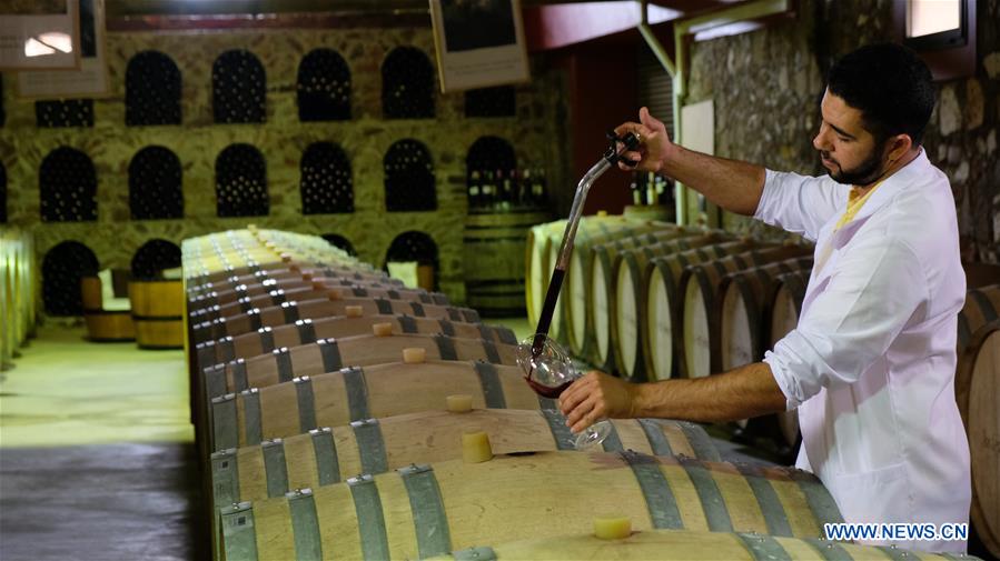 A staff member of Morocco's agricultural company Red Farm checks the wine in Rommani, Morocco, Oct. 11, 2019. As Chinese consumers are looking for high-quality imported goods, China International Import Expo (CIIE) is undoubtedly a rare opportunity for Moroccan companies interested in expanding their exports, said Mamoun Sayah, general manager of Morocco's agricultural company Red Farm. (Xinhua/Chen Binjie)