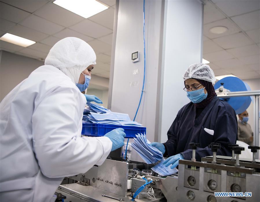 Workers produce masks at a factory in the free industrial zone of Cairo, capital of Egypt, April 14, 2020. Inside a joint Egypt-China plant inaugurated last week in the free industrial zone of Cairo, people are working day and night to run five advanced machines introduced from China to produce up to 750,000 medical face masks per day. (Xinhua/Wu Huiwo)