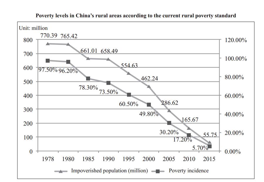 Poverty reduction is the most telling evidence of China's progress in human rights. Over the past 30 years or more since the launch of reform and opening up, more than 700 million Chinese people have been raised from poverty. The number of rural poor had fallen to 55.75 million by 2015, with the incidence of poverty dropping to 5.7 percent. Notable improvement has been made to infrastructure and basic public services, and poverty-reduction mechanisms have been innovated, thus contributing to the guarantee of the basic rights of the impoverished population. This has laid a solid foundation for achieving a moderately prosperous society in all respects.