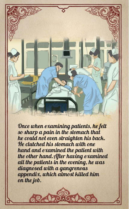 4. Once when examining patients, he felt so sharp a pain in the stomach that he could not even straighten his back. He clutched his stomach with one hand and examined the patient with the other hand. After having examined all the patients in the evening, he was diagnosed with a gangrenous appendix, which almost killed him on the job.