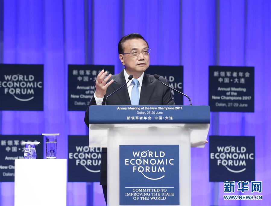 Çin Başbakanı Li Keqiang, 27 Haziran 2017-de ülkenin kuzeydoğusunda yer alan Dalian kentindeki uluslararası konferans merkezinde düzenlenen 2017 Yaz Davos Forumu’nun açılış töreninde bir konuşma yaptı. (fotoğrafçı: Xinhua muhabiri Pang Xinglei)