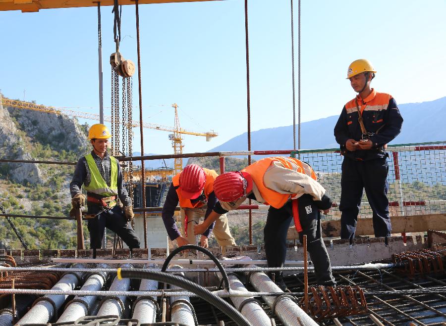 People work at the construction site of the Moracica bridge of Montenegro's first highway in a location about 14 kilometers north of Podgorica, capital of Montenegro, on Sept. 22, 2018. (Xinhua/Wang Huijuan)