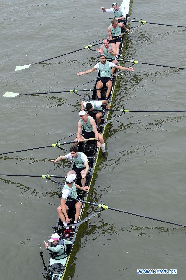 Cambridge University men's crew react after winning the men's boat race between Oxford University and Cambridge University on the River Thames in London on April 7, 2019. (Xinhua/Stephen Chung)