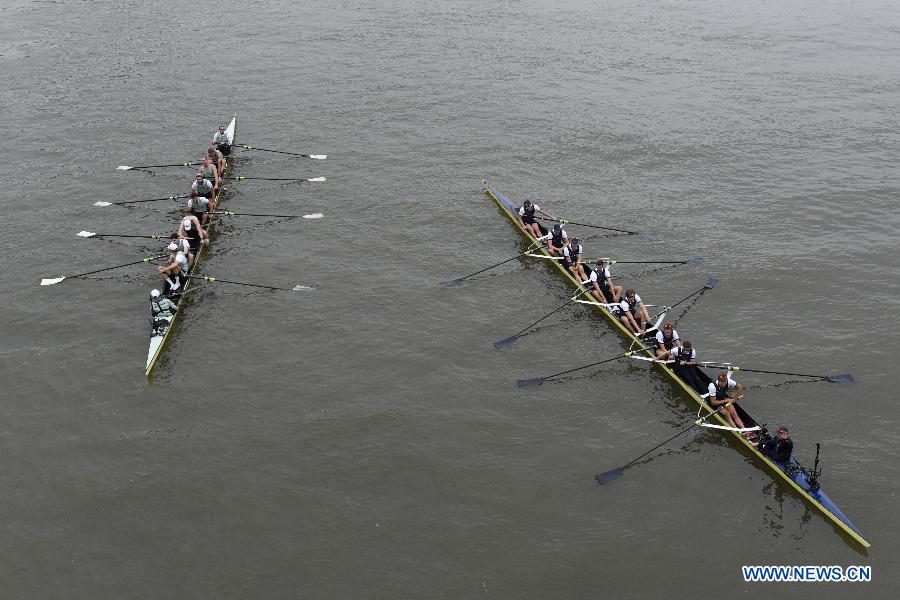 Cambridge University men's crew (L) react after winning the men's boat race between Oxford University and Cambridge University on the River Thames in London on April 7, 2019. (Xinhua/Stephen Chung)