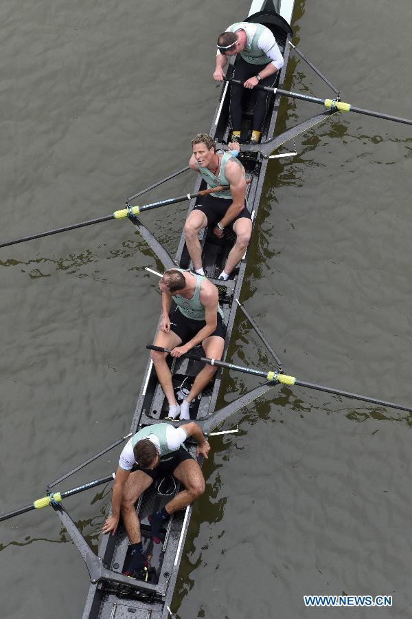 Cambridge University men's crew react after winning the men's boat race between Oxford University and Cambridge University on the River Thames in London on April 7, 2019. (Xinhua/Stephen Chung)