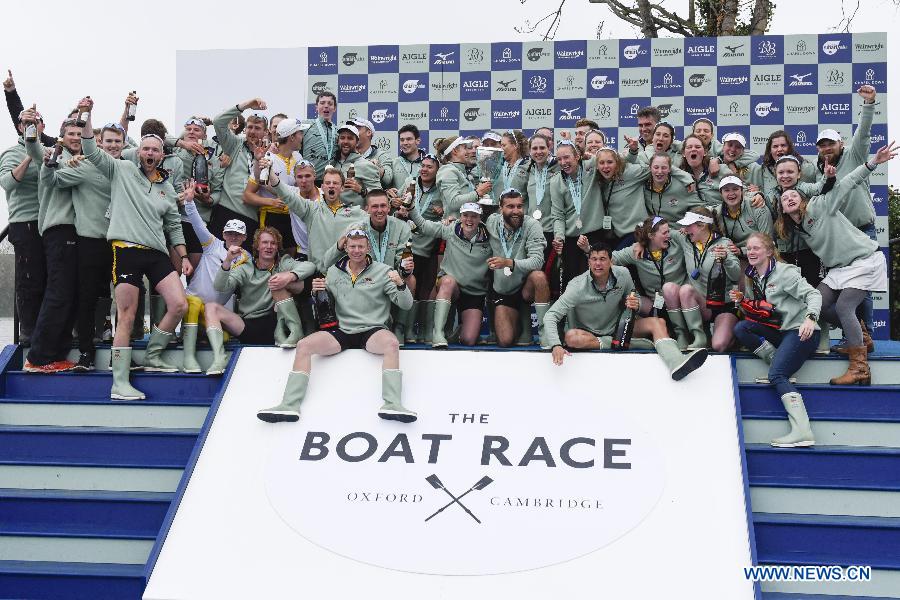 Crew members of Cambridge University celebrate winning the boat race between Oxford University and Cambridge University on the River Thames in London on April 7, 2019. (Xinhua/Stephen Chung)