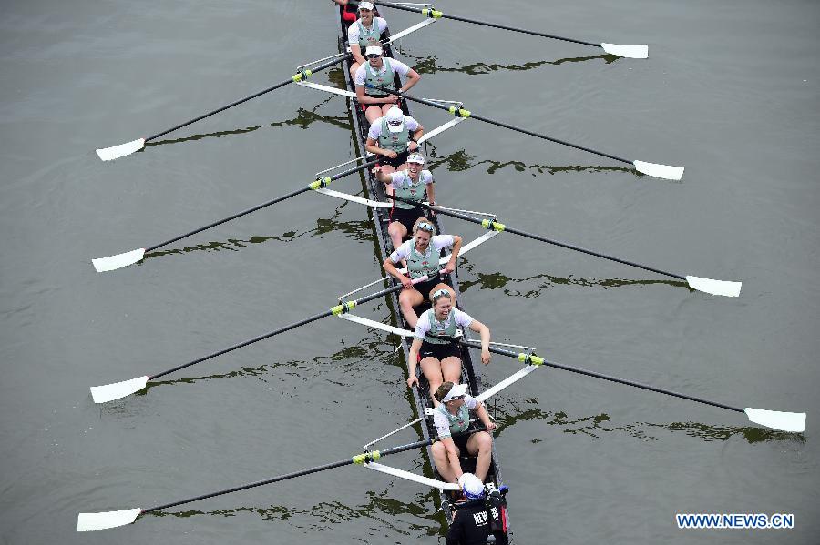 Cambridge University women's crew celebrate winning the women's boat race between Oxford University and Cambridge University on the River Thames in London on April 7, 2019. (Xinhua/Stephen Chung)