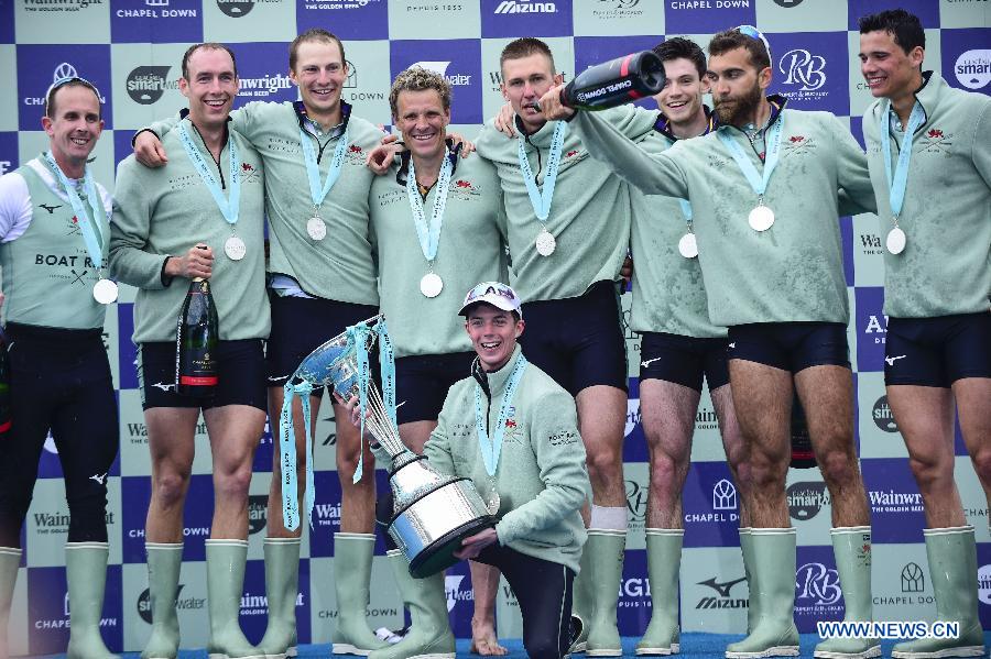 Cambridge University men's crew celebrate winning the men's boat race between Oxford University and Cambridge University on the River Thames in London on April 7, 2019. (Xinhua/Stephen Chung)