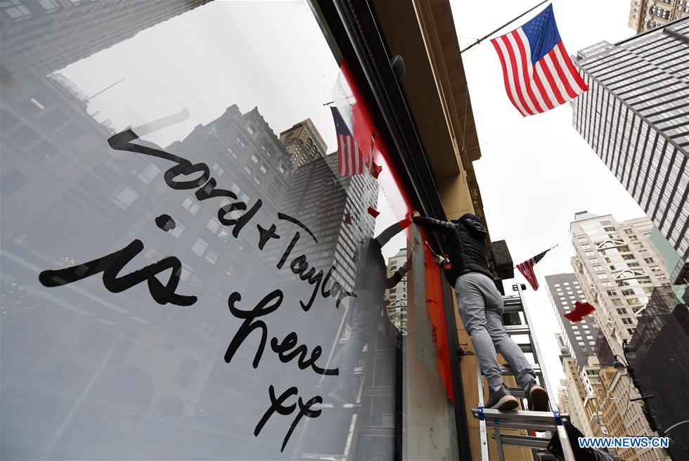 A worker cleans up window posters at the flagship store of the famous department store chain Lord & Taylor on Fifth avenue in Manhattan, New York, the United States, Jan. 2, 2019. The famous department store chain Lord & Taylor officially closed its flagship store on Fifth avenue in Manhattan, New York City. (Xinhua/Li Rui)