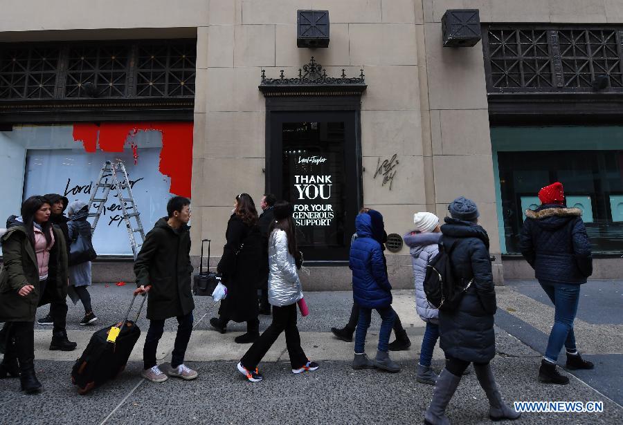 People walk past the shop window of the flagship store of the famous department store chain Lord & Taylor on Fifth avenue in Manhattan, New York, the United States, Jan. 2, 2019. The famous department store chain Lord & Taylor officially closed its flagship store on Fifth avenue in Manhattan, New York City. (Xinhua/Li Rui)