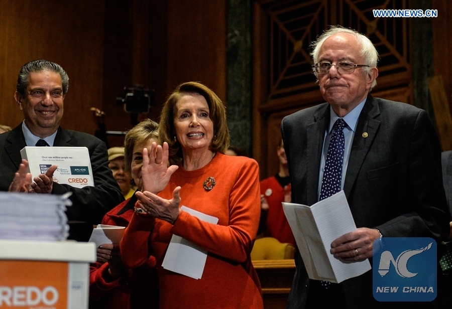 The file photo shows that U.S. House minority leader Nancy Pelosi (C) and Independent Senator Bernie Sanders (R) attend a press conference on defending the Medicare on Capitol Hill in Washington D.C., the United States, Dec. 7, 2016. (Xinhua/Bao Dandan)