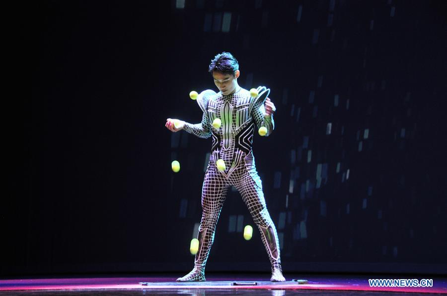 An actor from China National Acrobatic Troupe perform acrobatics in Houston of Texas, the United States, on Oct. 4, 2019. Hundreds of Chinese and American audiences marveled at the performance of acrobatics and Chinese traditional music Friday night in Houston, the fourth largest city in the United States. (Xinhua/Liu Liwei)