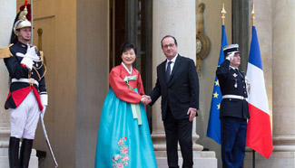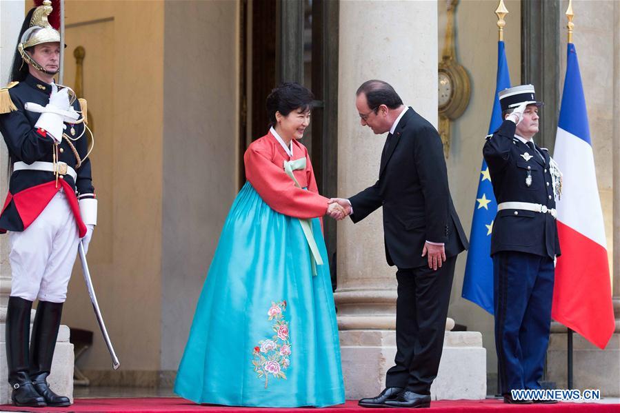 PARIS, June 3, 2016 (Xinhua) -- French President Francois Hollande(R) welcomes South Korean President Park Geun hye prior to an official dinner at elysee palace in Paris, France on June 3, 2016. (Xinhua/Nicolas Kovarik)
