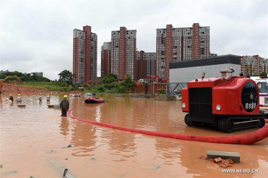 NANNING, June 4, 2016 (Xinhua) -- Workers use pumping equipment to drain water at flooded Baihualing station on Nanning subway Line 1 in Nanning, capital of south China's Guangxi Zhuang Autonomous Region, June 4, 2016. Downpour hit Nanning from June 3 to 4, which waterlogged Baihualing Station on Nanning subway Line 1, which is under construction. (Xinhua/Zhou Hua)