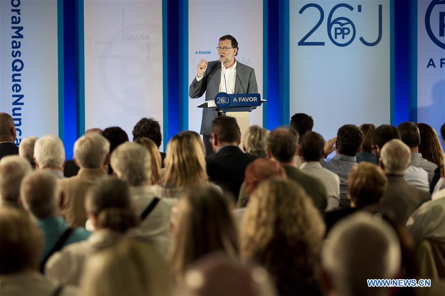 BARCELONA, June 5, 2016 (Xinhua) -- Acting Spanish Prime Minister Mariano Rajoy delivers a speech during an electional event of People's Party (PP) in Barcelona, Spain, on June 4, 2016. Acting Spanish Prime Minister Mariano Rajoy on Saturday promised to lower taxes, especially income tax, should his right-wing People's Party win the forthcoming general election in Spain. (Xinhua/Lino De Vallier)