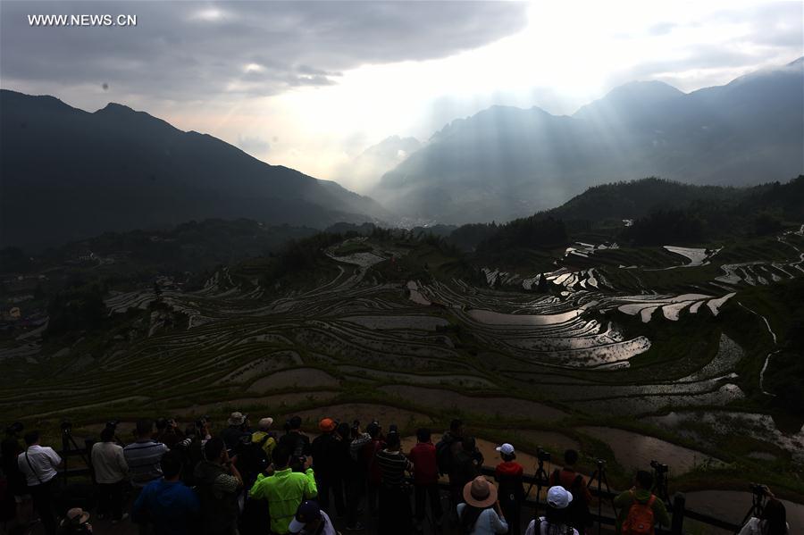 YUNHE, June 5, 2016 (Xinhua) -- People take pictures of the scenery of terrace fields in Yunhe County, east China's Zhejiang Province, June 5, 2016. (Xinhua/Huang Zongzhi)