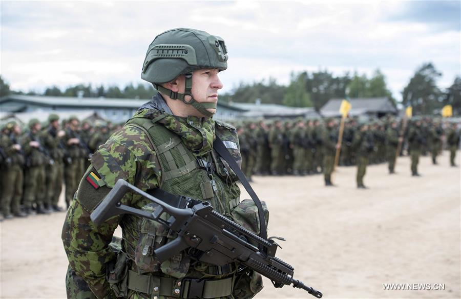 PABRADE, June 6, 2016 (Xinhua) -- Lithuanian soldiers participate in the opening ceremony of Iron Wolf 2016 in Pabrade, Lithuania, June 6, 2016. Multinational military exercise Iron Wolf 2016, part of the broader international military training in the Baltic states Saber Strike 2016, kicked off on Monday, with thousands of NATO allied personnel to train in Lithuania in the coming two weeks. (Xinhua/Alfredas Pliadis)