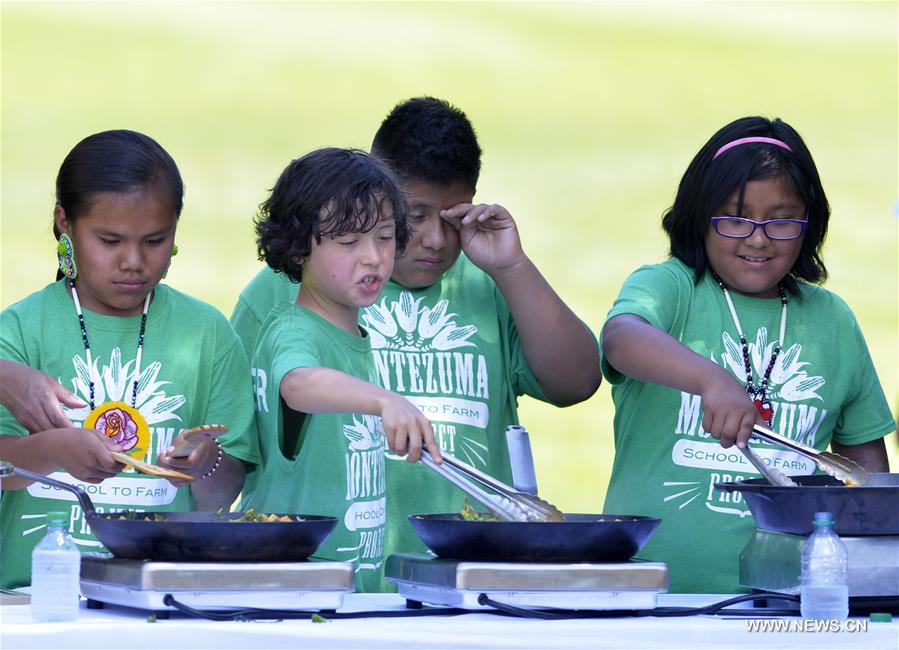 WASHINGTON D.C., June 6, 2016 (Xinhua) -- Students from Wisconsin, Colorado and Louisiana cook vegetable after a harvest at the White House Kitchen Garden in Washington D.C., the United States on June 6, 2016. (Xinhua/Yin Bogu)