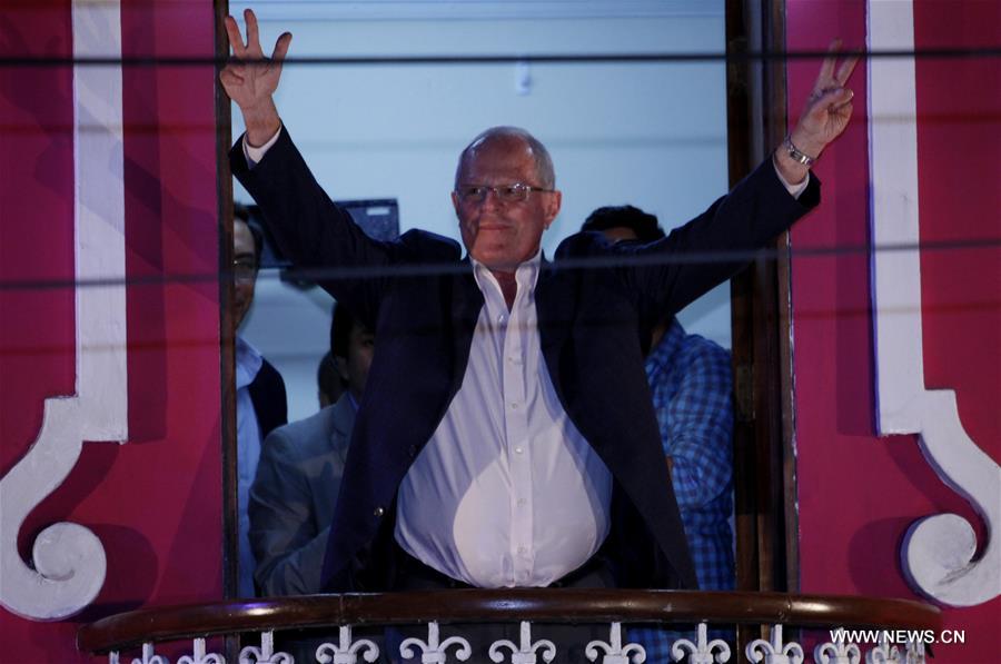 LIMA, June 6, 2016 (Xinhua) -- Presidential candidate Pedro Pablo Kuczynski of the Peruvians for Change (PPK) party waves to his supporters at the end of the second round of the presidential elections in the district of San Isidro, Lima Province, Peru, on June 5, 2016. (Xinhua/Luis Camacho)