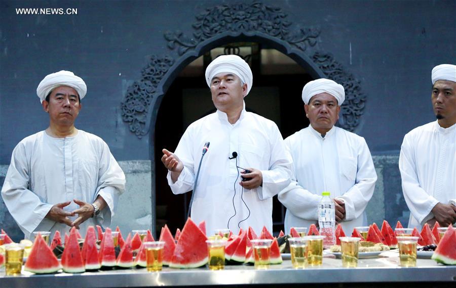 BEIJING, June 7, 2016 (Xinhua) -- Imam holds a ceremony to break the fast after sunset on the first day of Ramadan at the Niujie Mosque in Beijing, capital of China, June 6, 2016. (Xinhua/Pan Xu)