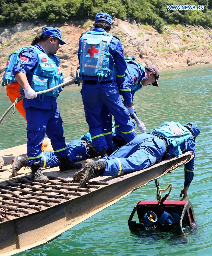 GUANGYUAN, June 7, 2016 (Xinhua) -- Rescuers put an underwater robot into water for the operation to search for the capsized leisure boat on Bailong Lake in Guangyuan City, southwest China's Sichuan Province, June 7, 2016. The underwater robot helped find a female victim at around 2 p.m. Tuesday, rescuers said. So far, there are three confirmed fatalities, including a child, and 12 people remain missing. (Xinhua/Xue Yubin)